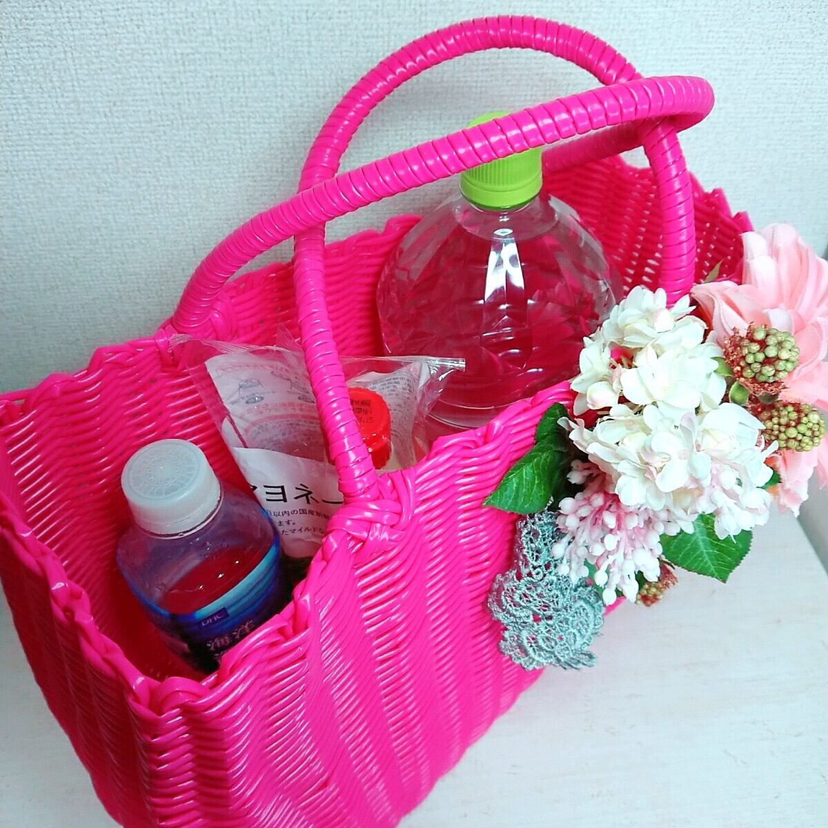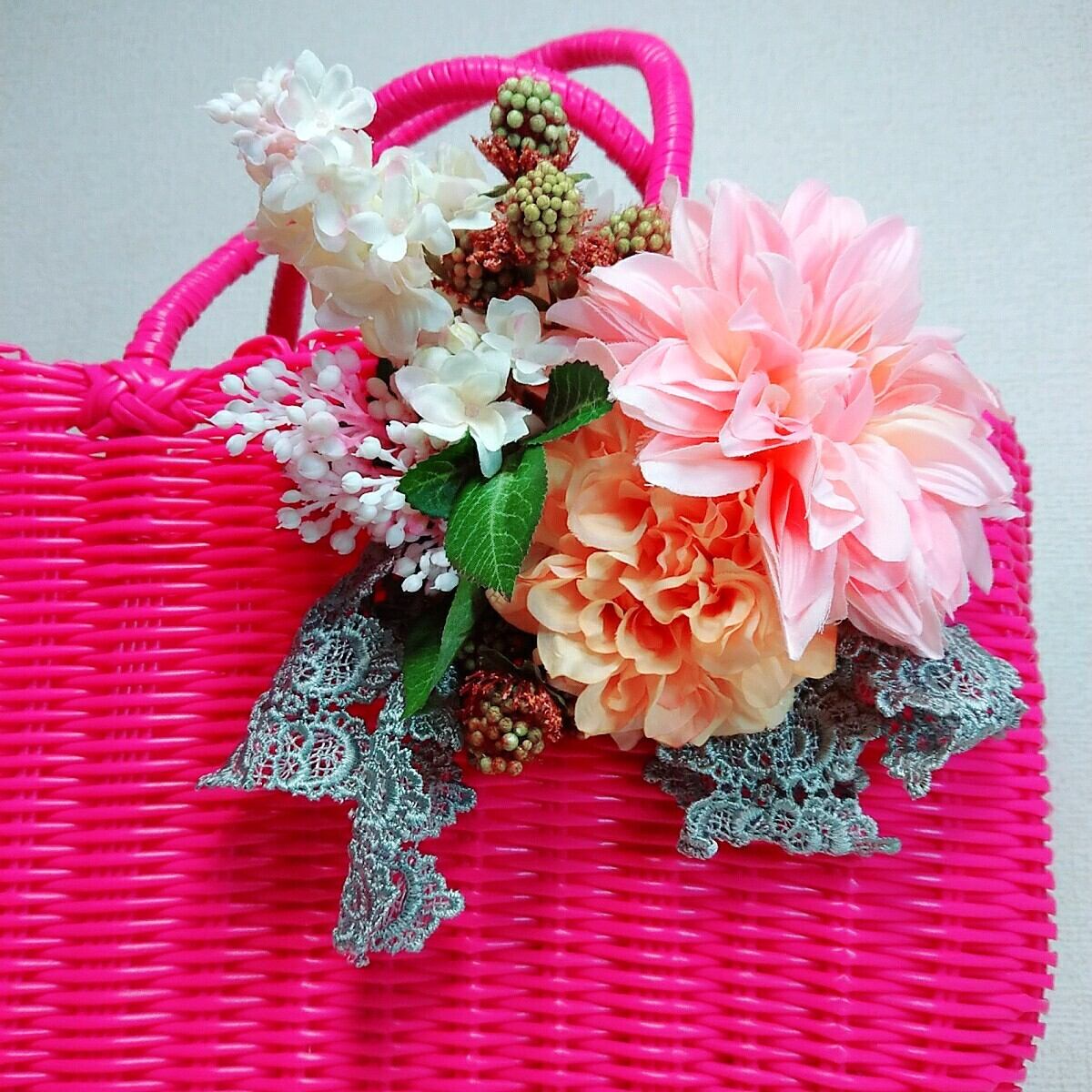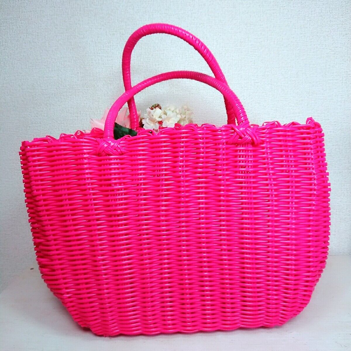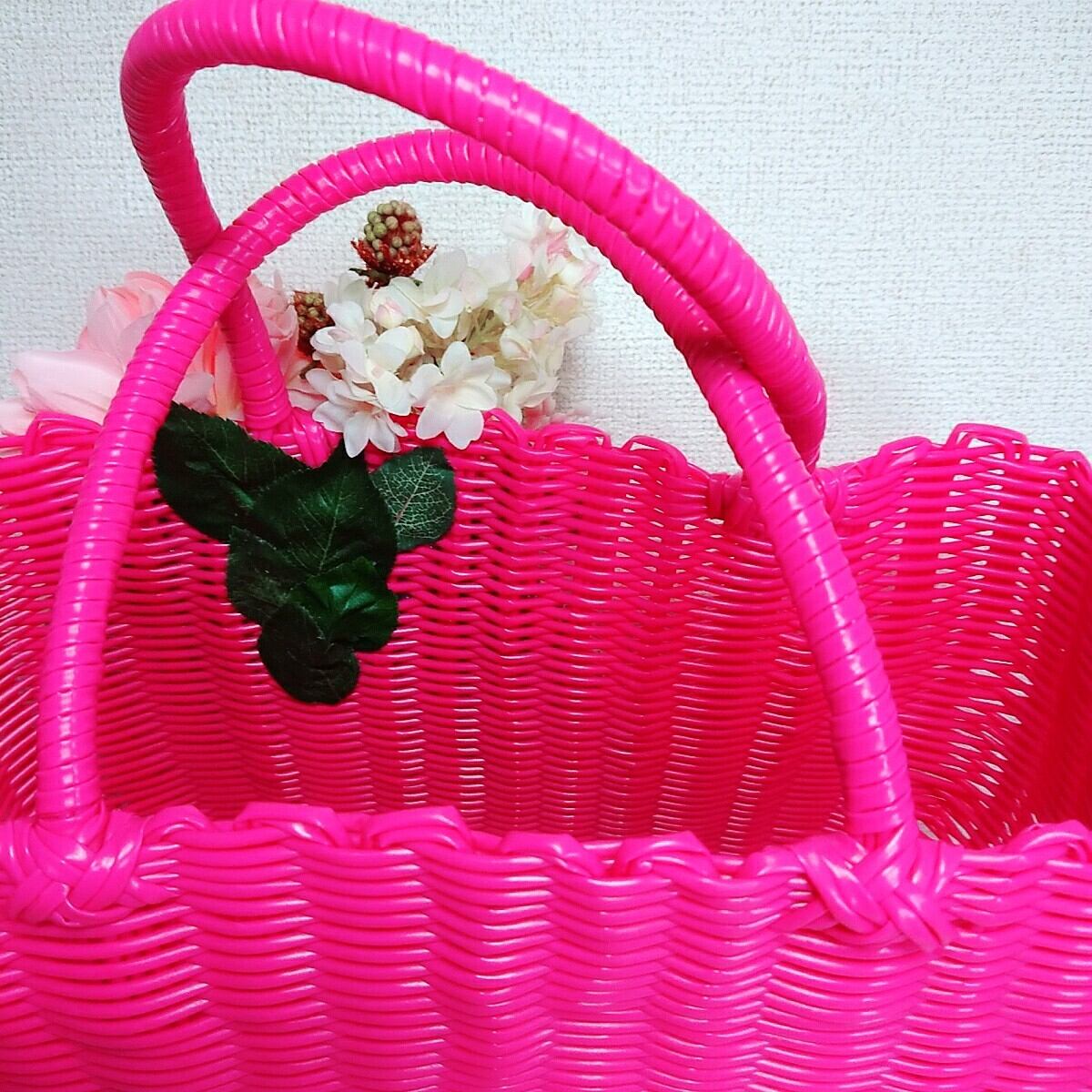 鮮やかなマゼンタピンクのビニールストローかごバッグは、Sakuya Princess オリジナルのコサージュ付き。